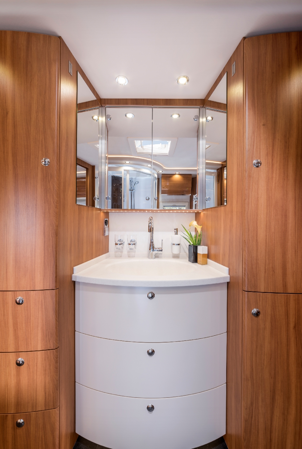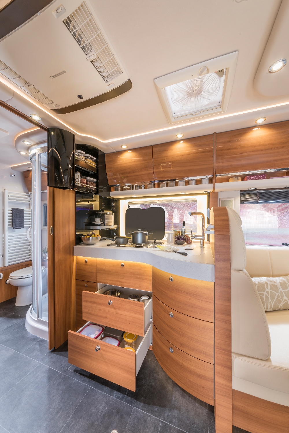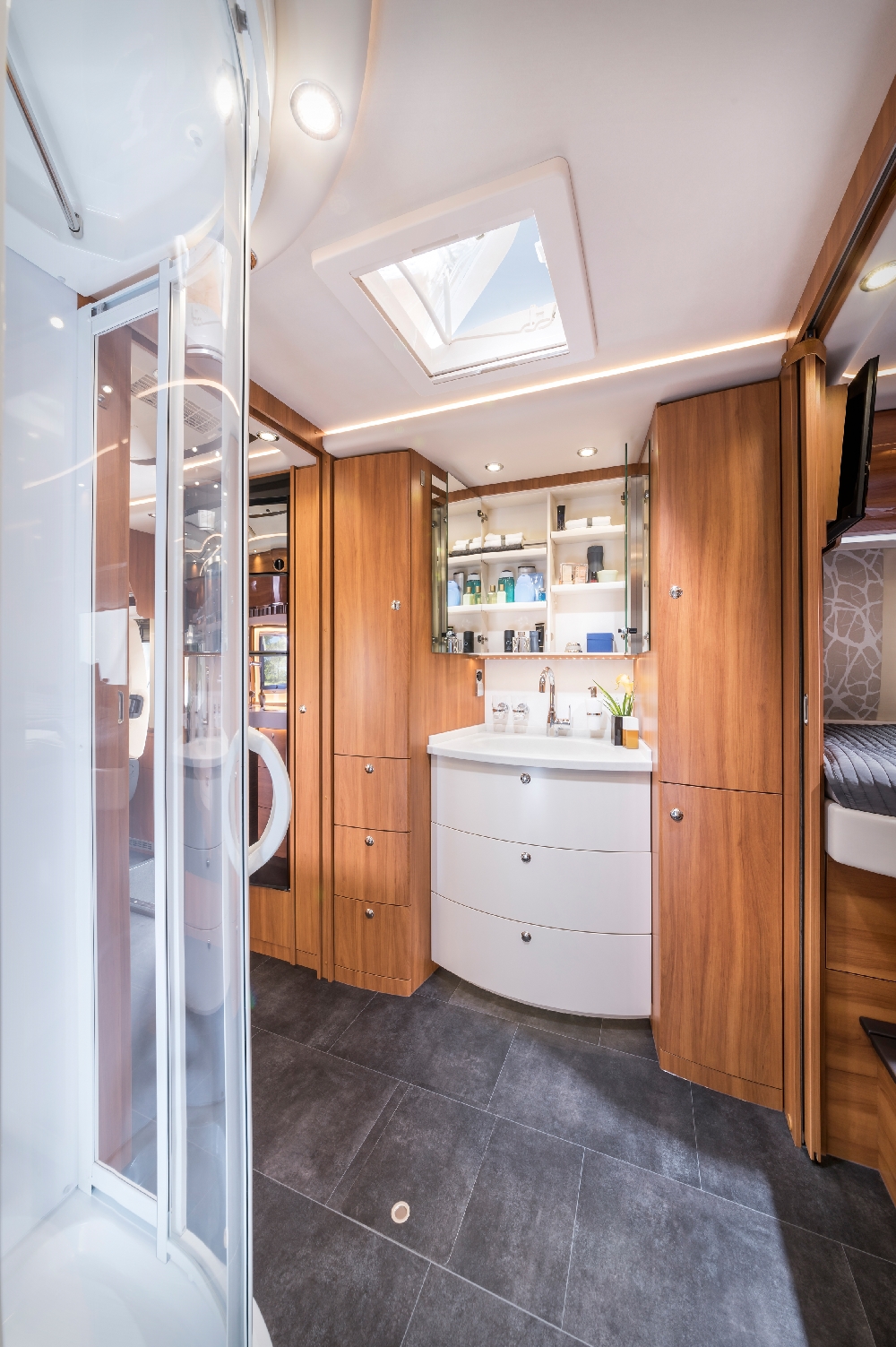 For 30 years chassis manufacturer Iveco has been one of Concorde’s most trusted and reliable suppliers. To mark this anniversary Concorde has launched a special edition of its best-selling Charisma model. Dubbed the ‘Edition 30 years on Iveco’ it is based on the Charisma 790 L. This has longitudinal single beds and a body length of eight metres, although the latter is hardly noticeable due to the vehicle design.